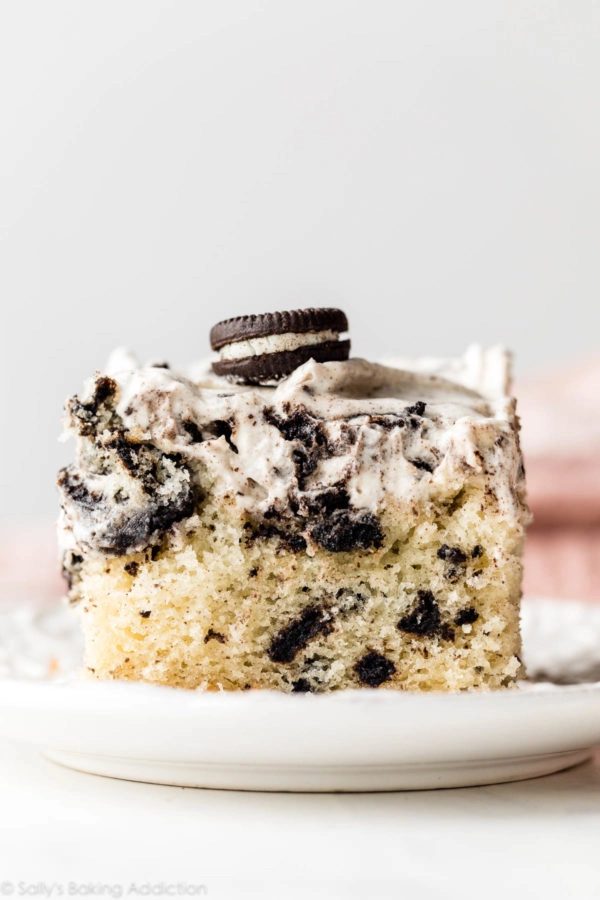 - If you’d like to pipe any frosting on the cake like I did in the photo above, set aside about 1 cup of frosting. Fold chopped Oreos into remaining frosting (or all of the frosting if you are not piping any of it). Spread onto cooled cake– it will be a thick layer of frosting. I find a small offset spatula is best for frosting 9×13 inch sheet cakes. For the pictured piping, I used a Wilton 1M piping tip and piped a zigzag design around the border.
