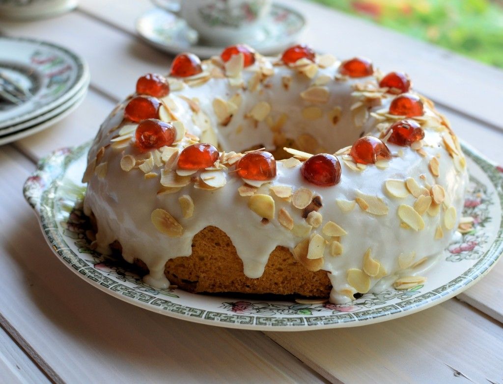 - Drizzle over the cooled cake using the back of a spoon, sprinkle over the toasted almonds and reserved cherries.