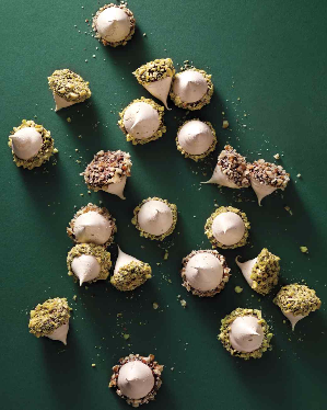 - Melt chocolate in a bowl set over a saucepan of simmering water, stirring until smooth; remove from heat. Working 1 at a time, dip base of each meringue in chocolate, then coat base completely with nuts. Transfer to parchment-lined baking sheets and let stand until set, about 1 hour. Meringues can be made 5 days ahead and stored in a cool, dry place at room temperature.