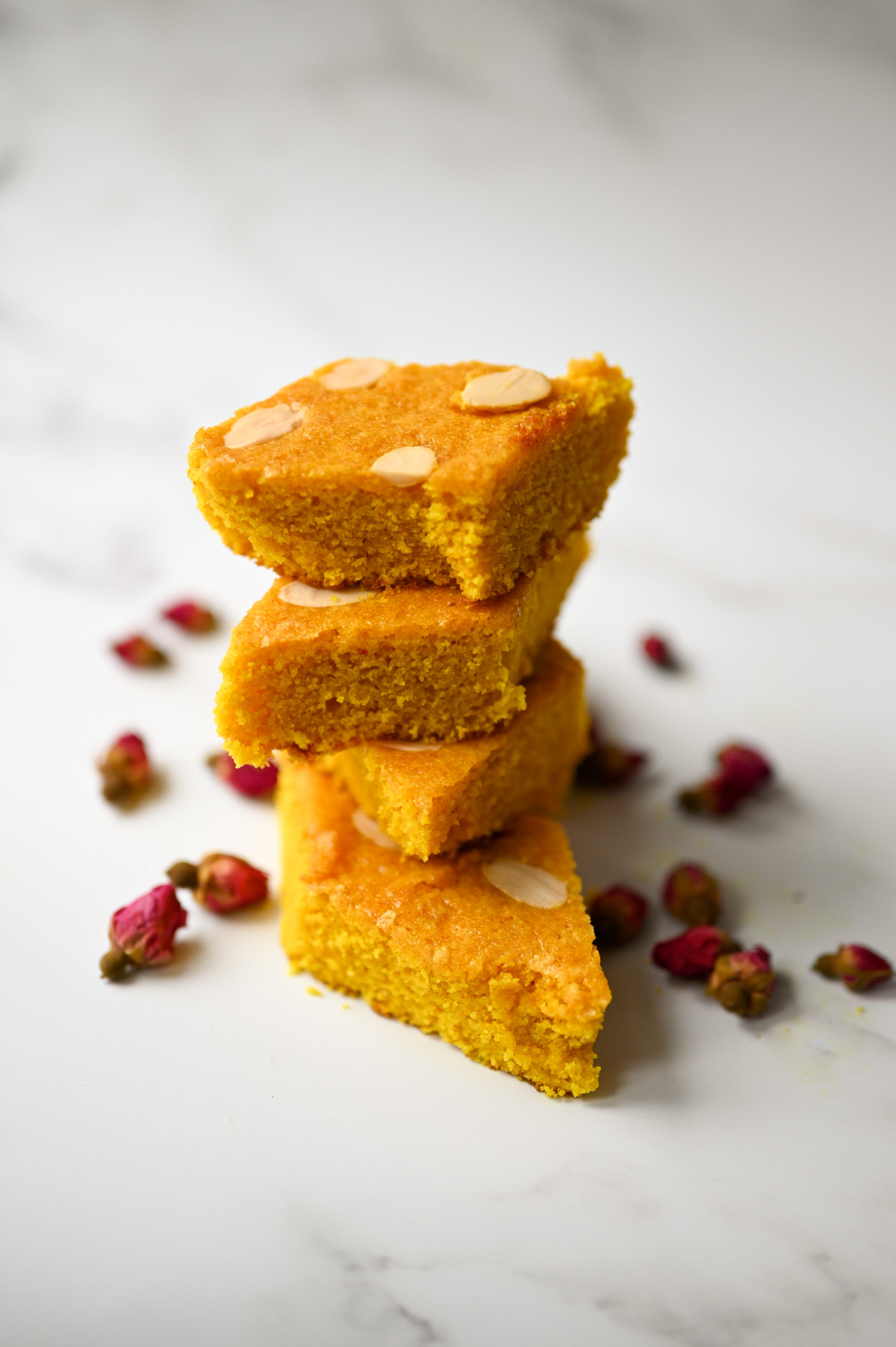 - In a large bowl, whisk together the semolina, flour, sugar, baking powder, and turmeric.