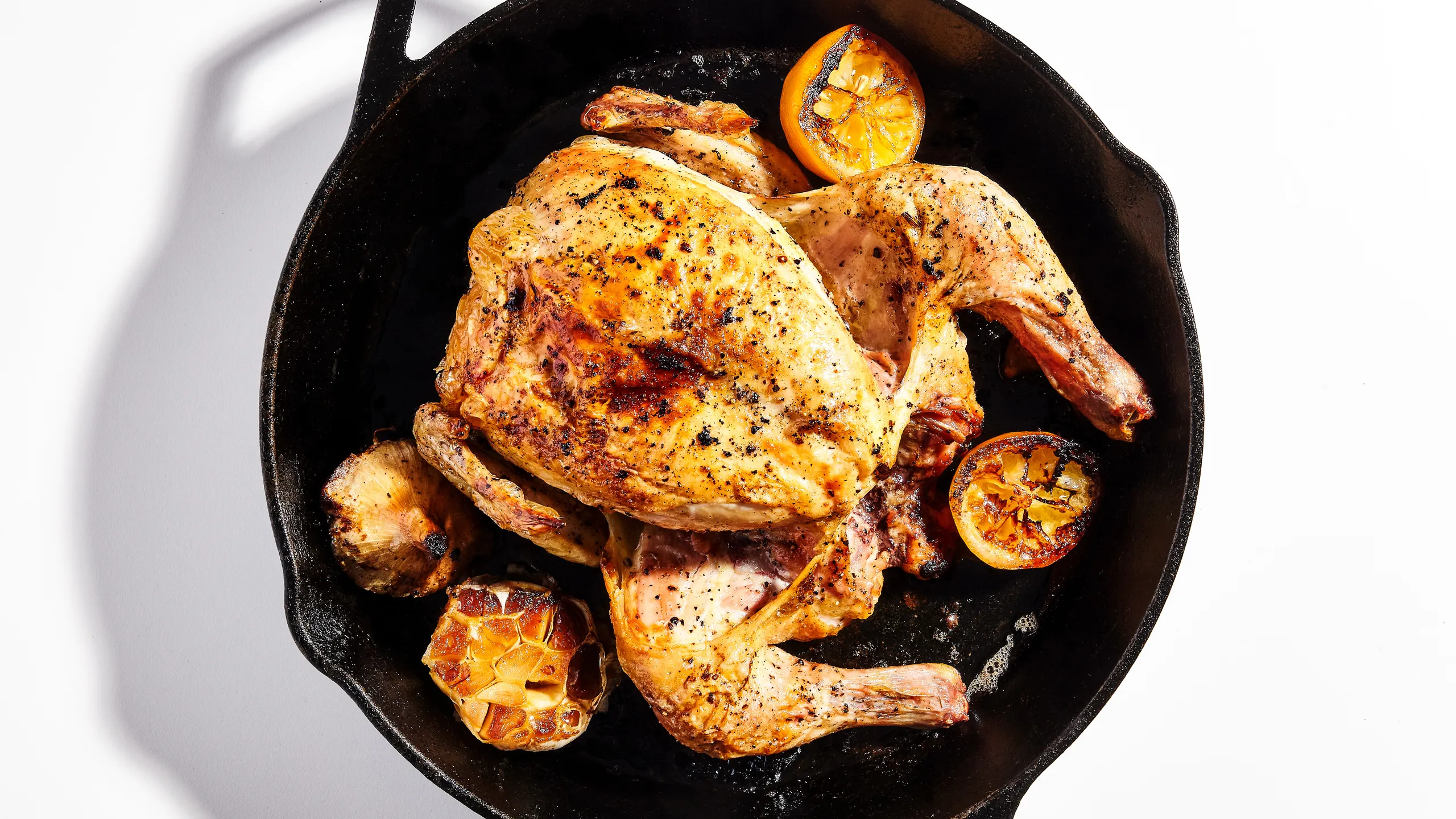 10. Let chicken rest in skillet at least 15 minutes before carving—this will help the juices in the meat to settle, and will also get it down to a temperature that is cool enough to handle with your bare hands while carving. Don’t worry: It’s a big piece of meat, so it will still be plenty warm by the time you serve it. Transfer chicken to a platter. Pour all of those glorious, buttery pan juices over top of the meat and serve with roasted lemon and garlic alongside. Winner, winner, chicken dinner!
